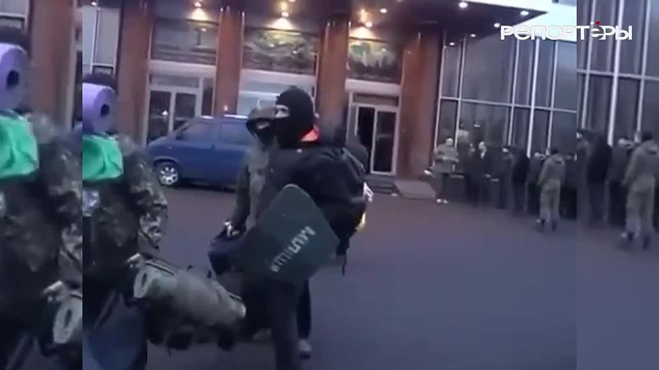 Молодцеватые музыканты парни в военной одежде покидают гостиницу "Днепр" с футлярами от оружия. У дверей гостиницы стоит Андрей Парубий.