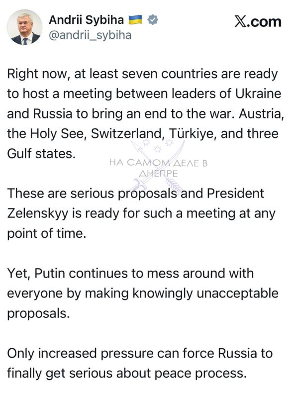 «Сейчас как минимум семь стран готовы принять встречу лидеров Украины и России, чтобы положить конец войне. Это Австрия, Святой Престол, Швейцария, Турция и три государства Персидского залива. Это серьезные предложения, и президент Зеленский готов к такой встрече в любой момент.Однако Путин продолжает морочить всем голову, делая заведомо неприемлемые предложения. Только усиление давления может заставить Россию наконец серьезно отнестись к мирному процессу».