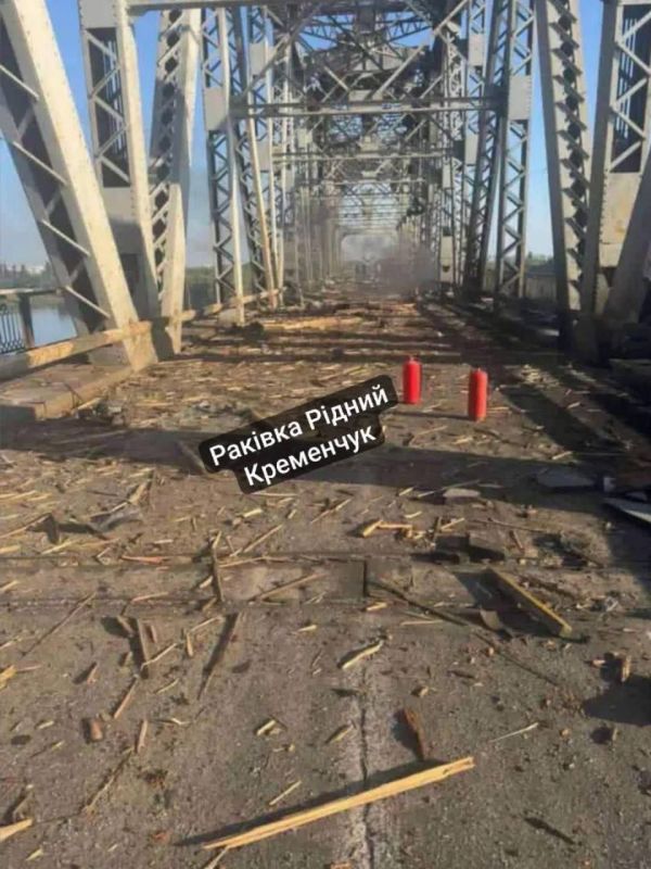 Последствия удара "Гераней" по Крюковскому железнодорожному мосту через Днепр.