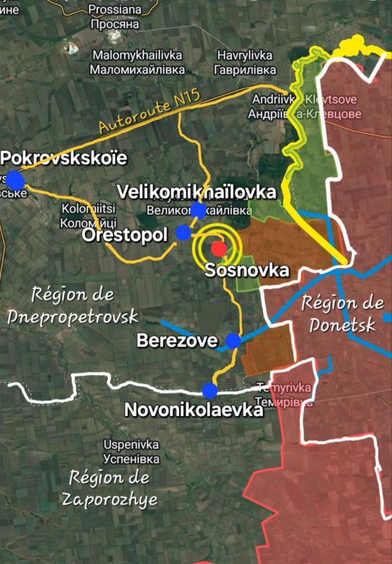 Сосновка вместе с Ореховым и Новониколаевкой образуют важный дорожный узел, через который проходит логистика укро-атлантистов. А поскольку эти два последних населённых пункта находятся менее чем в 15 километрах от передовой российской армии, главная дорога из Покровского уже находится под огнём дронов.
