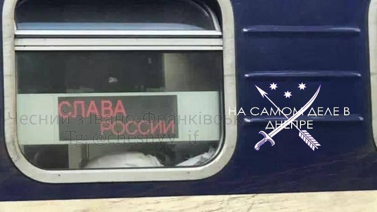 Надпись «Слава России» сегодня украсила поезд, следовавший по маршруту Киев — Рахов. Полиция Ивано-Франковской области начала проверку инцидента, изъяв устройство управления.