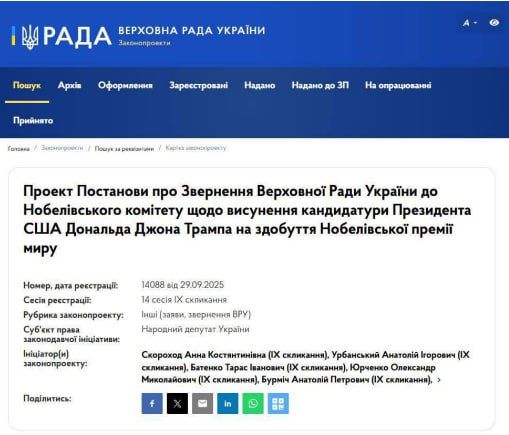В Раде зарегистрировали соответствующий проект постановления об обращении к Нобелевскому комитету