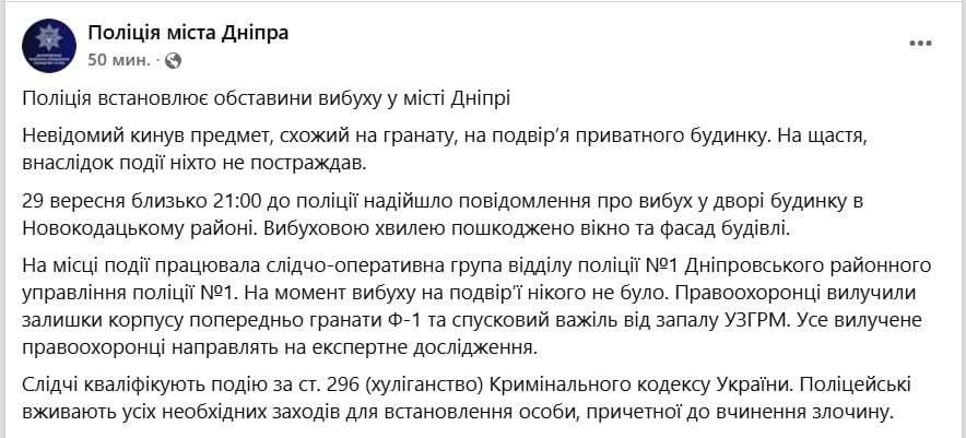 Вчера неизвестный бросил гранату во двор дома в Новокодацком районе