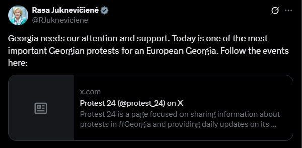 После этого вылезли "поддерживающие" грузинскую "оппозицию из Европы, депутат ЕП из Литвы Расы Юкнявичене написала в соцсети X: