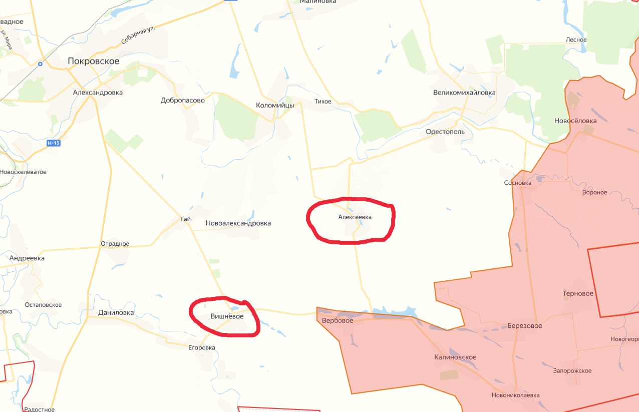 Военкор Тимофей Ермаков подтверждает продвижение российских подразделений к Алексеевке. Кроме того, с началом боёв в Вишнёвом становится очевидным — восточный фланг обороны ВСУ в районе пгт Покровское даёт трещину.