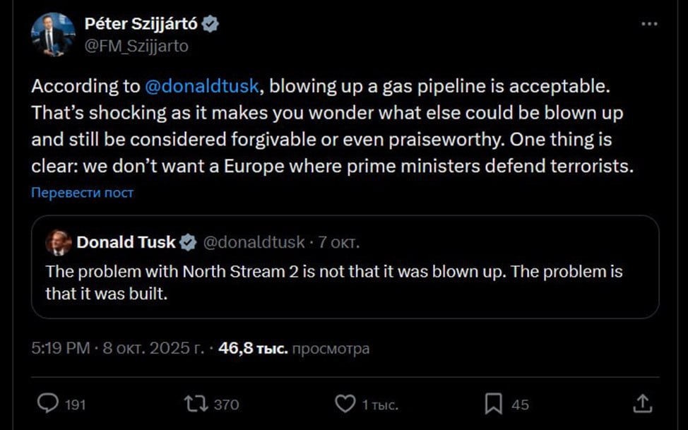«По словам Дональда Туска, подрыв газопровода — это приемлемо. Это шокирует, поскольку заставляет задуматься, что ещё можно взорвать, чтобы это считалось простительным или даже похвальным. Ясно одно: нам не нужна Европа, где премьер-министры защищают террористов».