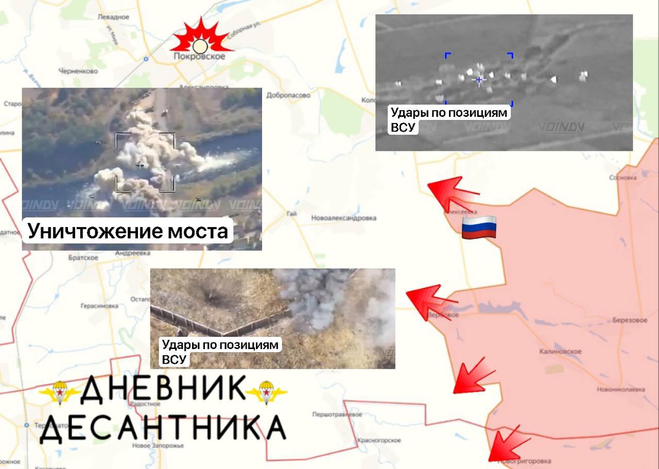 Продолжается и уничижение логистических маршрутов на даном участке, в Покровском ВКС РФ уничтожили мост через реку Волчья, соединявшего Покровское с Александровкой, после чего снабжение группировки противника критически осложнилось.