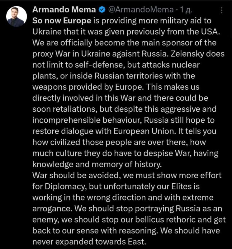 «Теперь Европа предоставляет Украине больше военной помощи, чем ранее давали США. Мы официально стали главным спонсором прокси-войны на Украине против России. Зеленский не ограничивается самообороной — он атакует ядерные объекты и наносит удары по территории России оружием, поставленным Европой. Это делает нас прямыми участниками этой войны, и вскоре могут последовать ответные меры. Но несмотря на такое агрессивное и непонятное поведение, Россия всё ещё надеется восстановить диалог с Европейским союзом. Это говорит о том, насколько цивилизованные там люди, насколько они культурны, насколько глубоко в них укоренено отвращение к войне, знание и память истории. Войны следует избегать, мы должны прилагать больше усилий к дипломатии. Но, к сожалению, наши элиты движутся в неправильном направлении и проявляют крайнее высокомерие. Мы должны перестать изображать Россию врагом, прекратить воинственную риторику и вернуть здравый смысл. Мы никогда не должны были расширяться на Восток».