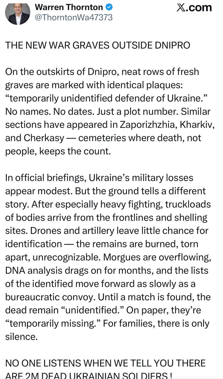 На этот раз не совсем в стандартном формате – кадры со свежими могилами из района г. Днепропетровск опубликовал на своей странице в X британский блогер Уоррен Торнтон. Нет смысла подробно останавливаться на его личности – западные и украинские СМИ его маргинализируют, как и всех пророссийски настроенных публичных лиц, что показательно само по себе.