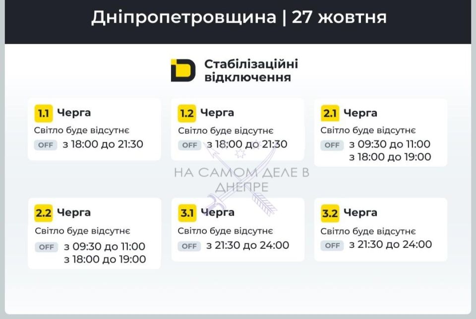Днепропетровская область, обновлённый график отключения электроэнергии.