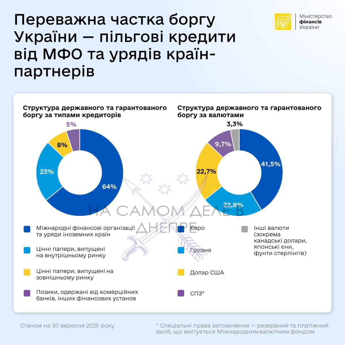 Отмечается, что за сентябрь 2025 года общая сумма госдолга и долга, гарантированного государством, выросла на 78,4 миллиарда гривен, или на 1,63 миллиарда долларов. Этот рост обусловлен в основном получением финансовой помощи на льготных условиях от Европейского Союза, Всемирного банка и правительств "дружественных" государств. При этом, внутренний государственный долг в сентябре 2025 года немного уменьшился – на 0,3 миллиарда гривен.