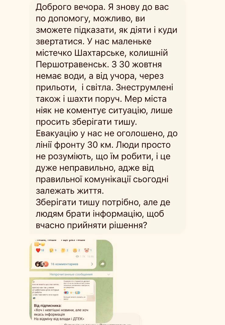 В Шахтерском Днепропетровской области пятый день нет воды, а после позавчерашнего обстрела - и света, не работают шахты, жалуются местные жители нардепу Гончаренко*