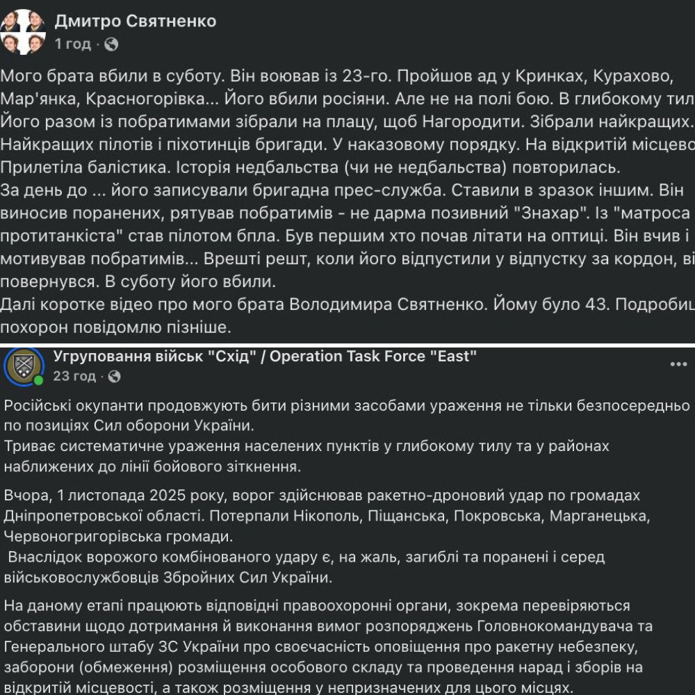 В субботу, 1 ноября, личный состав, включая «лучших пилотов и пехотинцев бригады», был собран в приказном порядке на открытой территории для награждения, куда прилетела ракета.