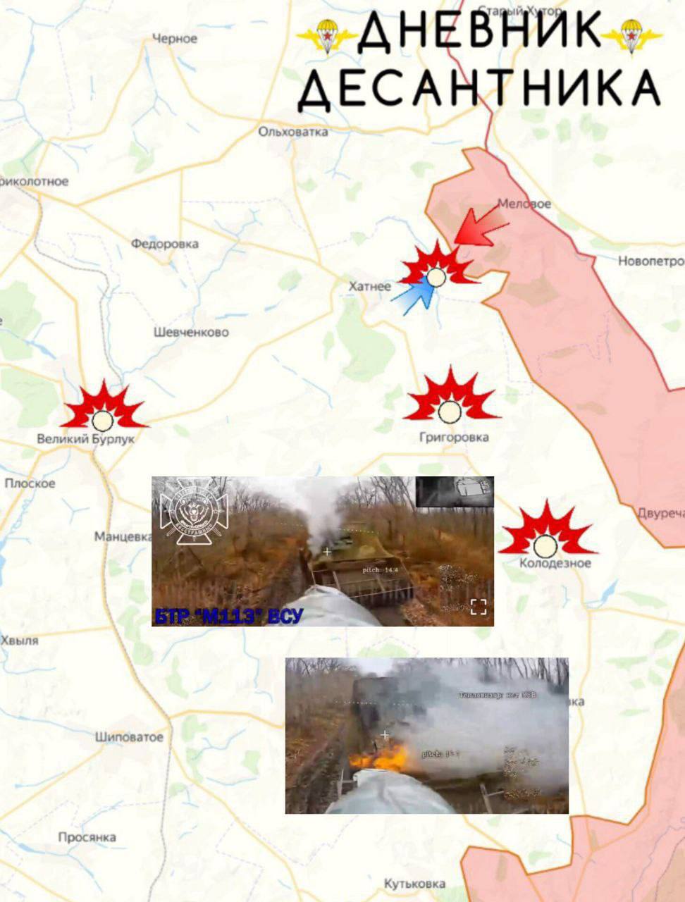 На участке фронтаот Мелового до Хатнее в ходе боевых действий мы продвинулись, отразив одну атаку врага и комплексным огневым поражением уничтожили БМП-2 ВСУ вместе с личным составом;