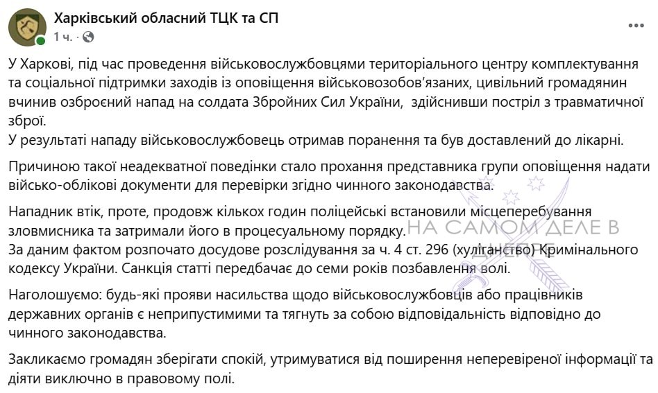По информации областного ТЦК, инцидент произошел, когда "военнослужащий попросил у водителя документы для проверки".