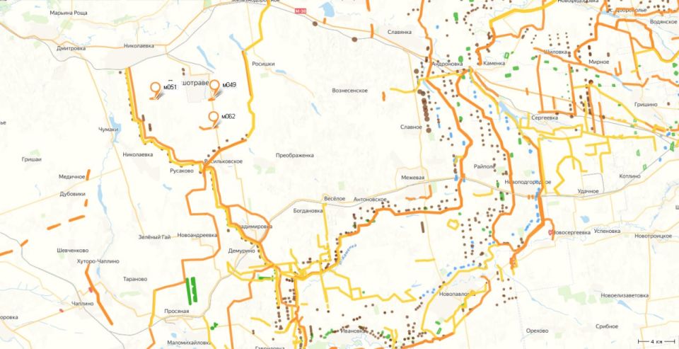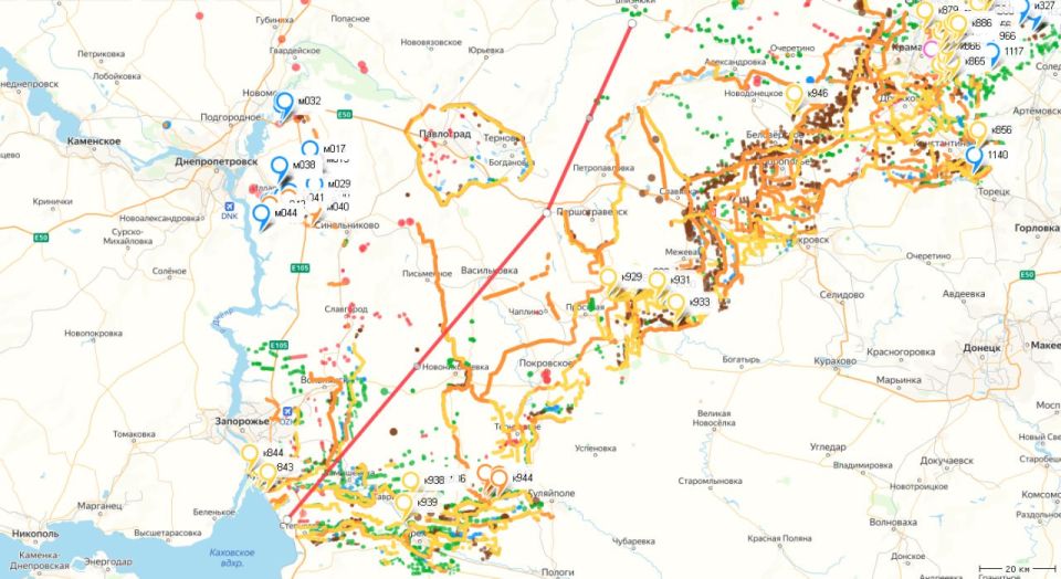 Запорожье и Днепропетровская области. На карте условная линия препятствия, она нанесена для понимания объема необходимого строительства. По снимкам за три дня, видно, что скорость работ экскаватора равна 60 метров в день. Длина условного препятствия 163 км. Количество экскаваторов в поле примерно 30 штук.