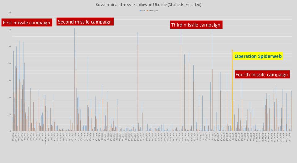 Таким образом, Россия переходит от дорогостоящего насыщения крылатыми ракетами к массовому насыщению дронами-камикадзе. Количество ракет остаётся низким и почти неизменным (около 6-7 в день), но они используются в меньшем количестве и более целенаправленно для нанесения ударов по важным объектам — ТЭС, ГЭС, газоперерабатывающим предприятиям, компрессорным станциям и ключевым подстанциям, обслуживающим АЭС и высоковольтные сети.