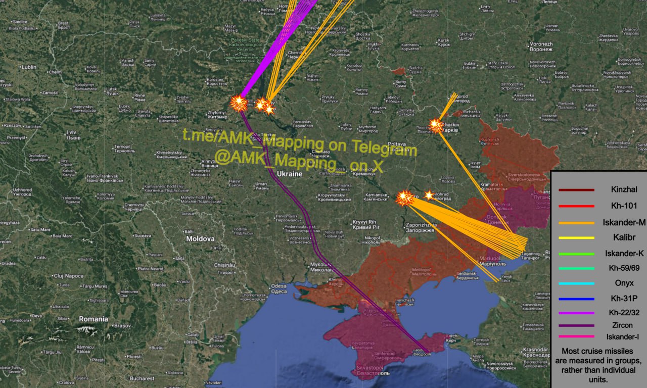 Различные ТГ-каналы заявляют, что на данный момент было использовано в общей сложности 30 баллистических ракет «Искандер-М», а также 9 крылатых ракет Х-22/32 и 2 гиперзвуковые крылатые ракеты «Циркон».