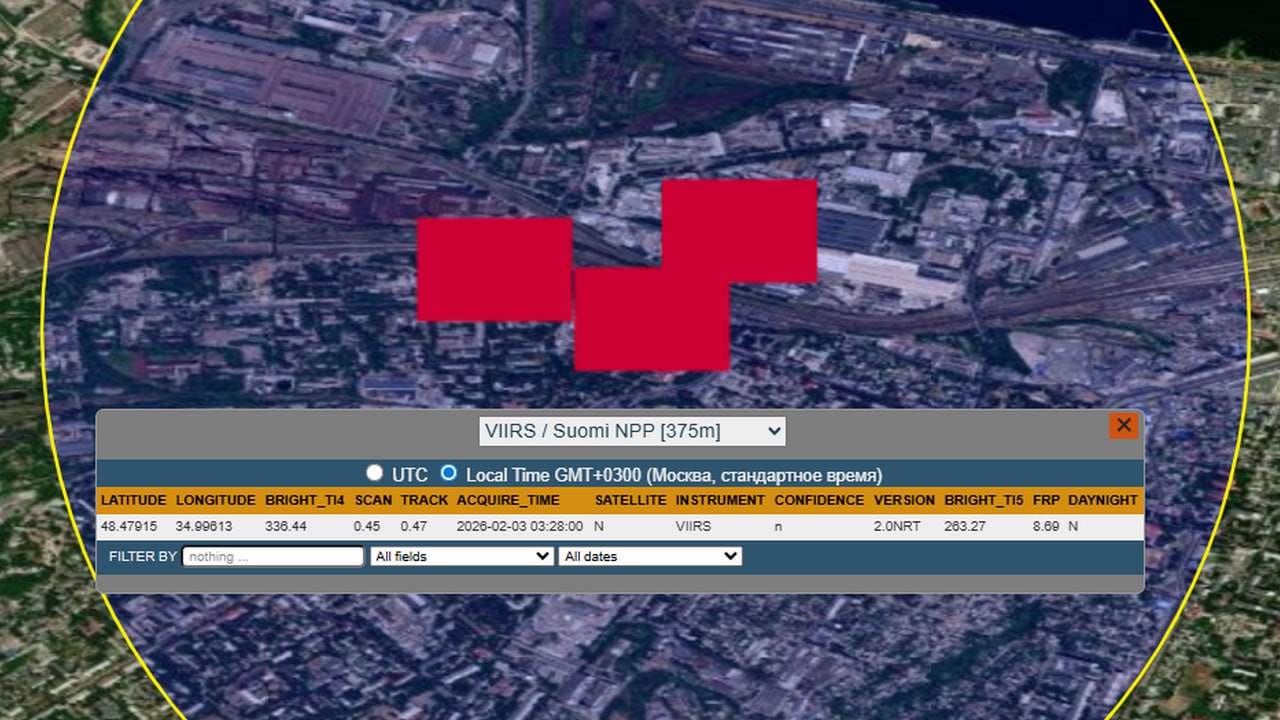 Отметки о возгораниях на сервисе FIRMS позволяют узнать о пожарах вследствие ударов на Приднепровской ТЭС и железнодорожной станции Горяиново в Днепропетровске.