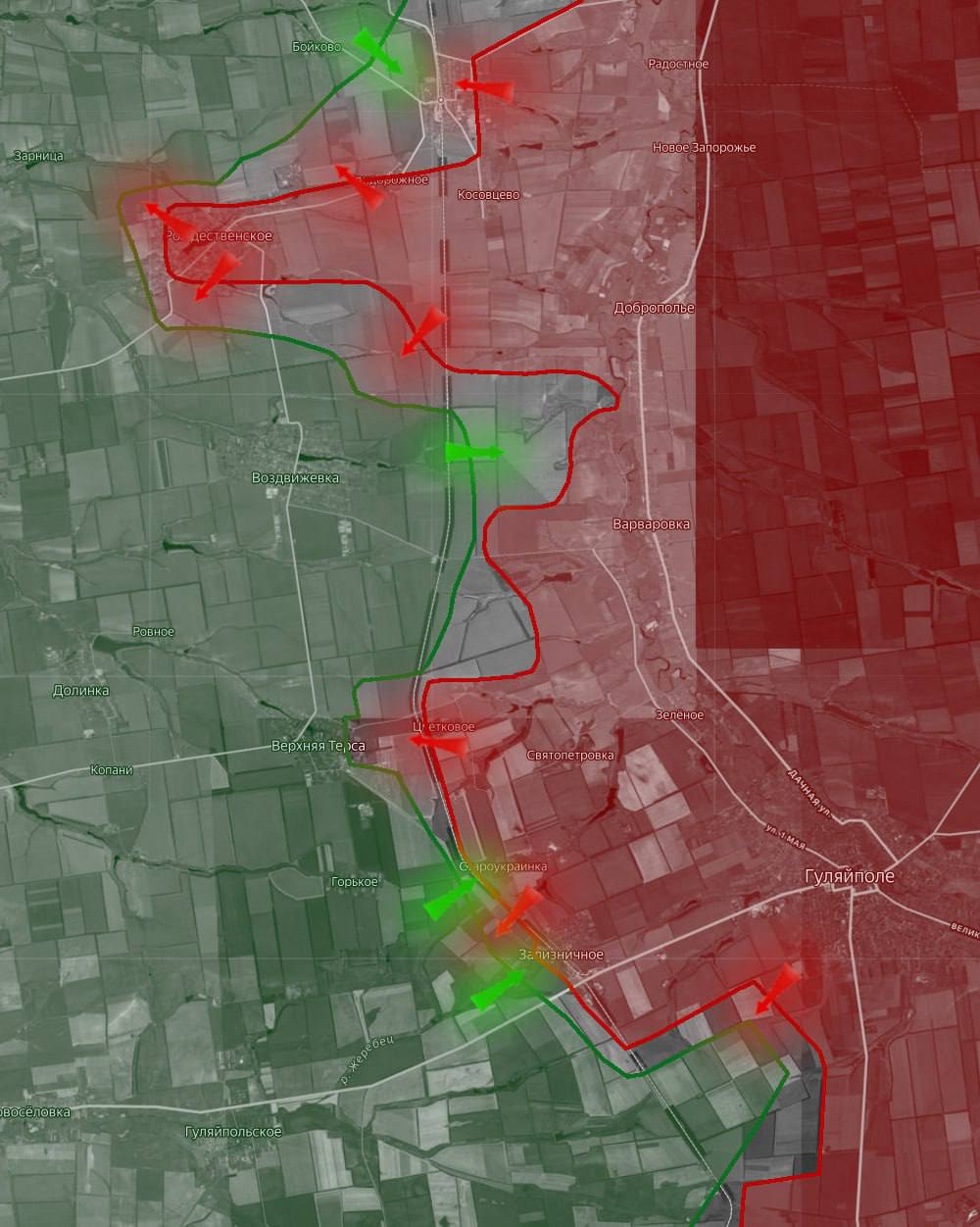 «На Днепропетровском направлении ВС РФ заняли несколько лесополос и опорный пункт на окраине Зализничного. На рубеже Еленоконстантиновка – Прилуки российские войска восстановили позиции между рекой Гайчур и железной дорогой.