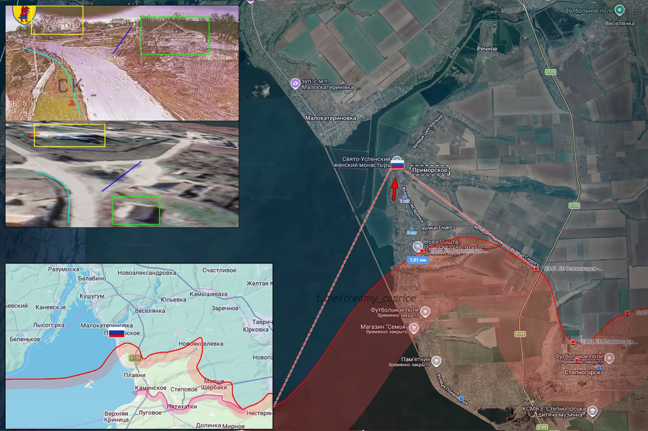 Военнослужащий ВС РФ попал под обстрел ВСУ в жилой застройке Приморского. ВС РФ продвигаются вдоль бывшего берега Каховского водохранилища до 3 км и занимают новые позиции в северной части посёлка.