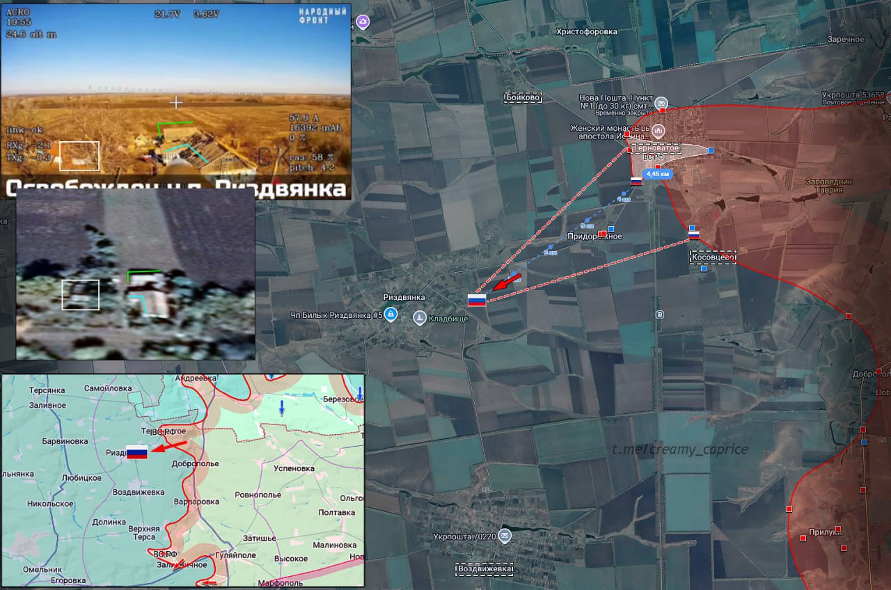 Военнослужащий ВС РФ поднял флаг Российской Федерации в жилой застройке Риздвянки. ВС РФ продвинулись на 4,5 км к западу от Терноватого и заняли новые позиции на восточной окраине населённого пункта.