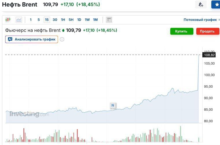 На лондонской бирже цена на нефть Brent впервые с 2022 года поднялась выше отметки в 102 доллара. Сейчас стоимость барреля нефти уже составляет 108 долларов.