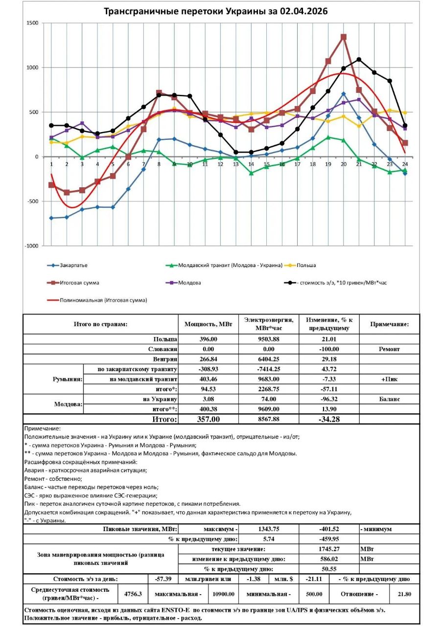 Данные за 2 апреля подтверждают резкое сокращение импорта электроэнергии. Причина не в «избытке» собственной генерации, а в плановых ремонтах у западных партнеров: словацкое направление закрыто на обслуживание, а из-за работ на румынской АЭС «Черноводы» транзит через Молдавию фактически обнулился.