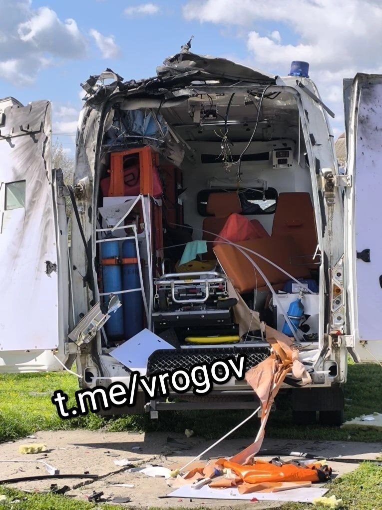 Разрушенные и повреждённые здания школы, уничтоженная машина скорой помощи