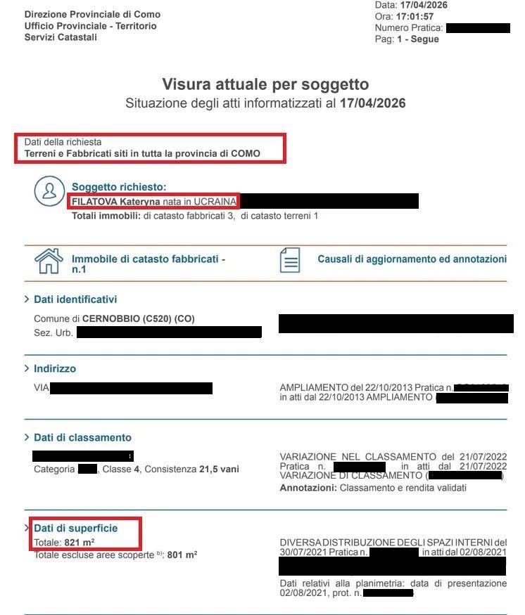По данным открытых реестров Италии, на Филатову Екатерину оформлена недвижимость в городе Cernobbio на озере Комо.