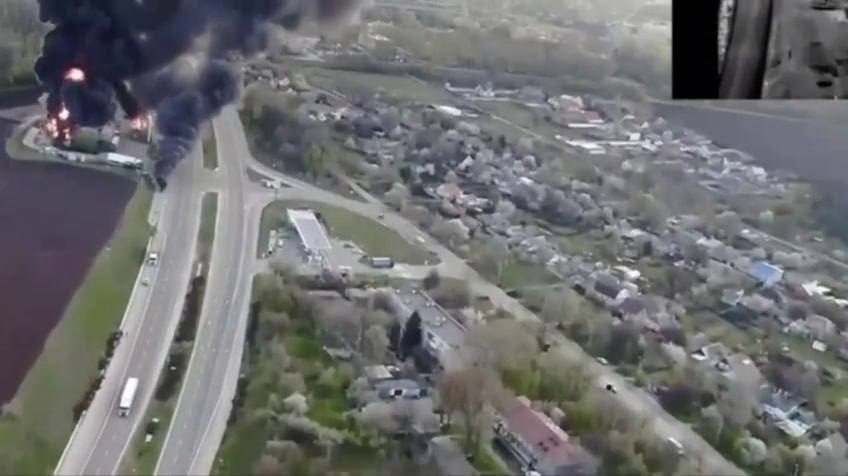 В конце видео кадры с горящей АЗС, по которой пару дней назад прилетела «Герань».